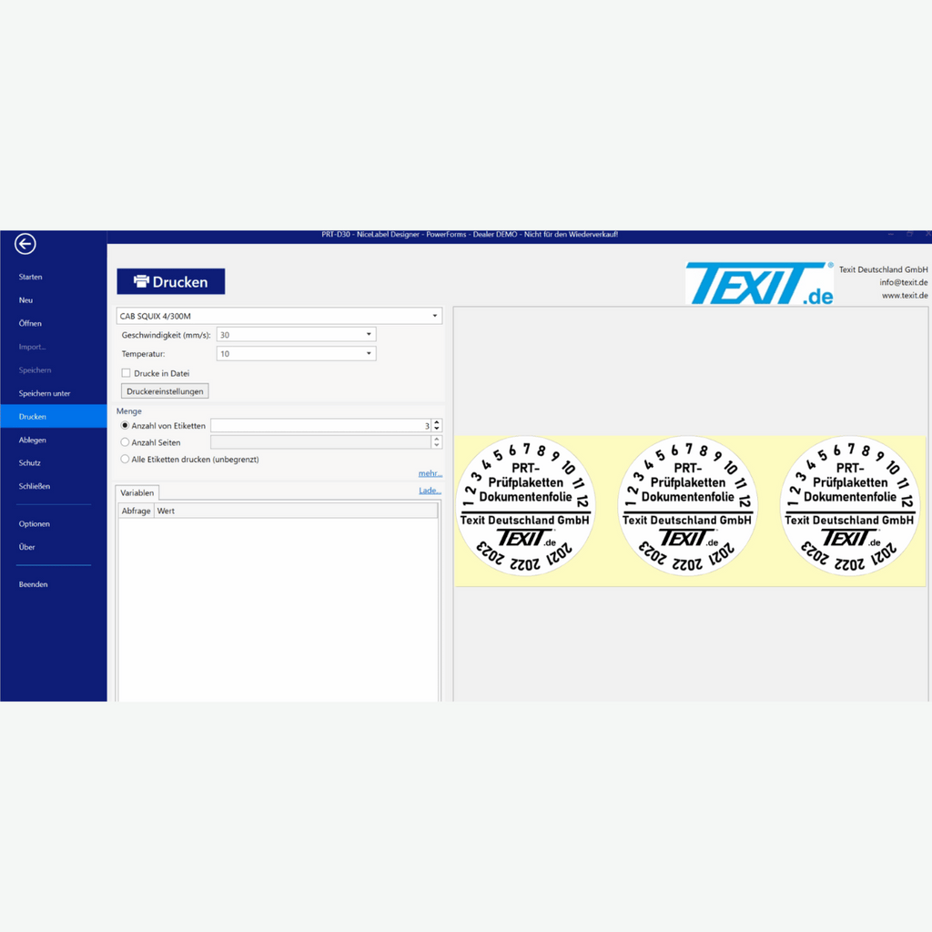 Wenn Sie Material und Drucker passend ausgesucht haben, geht es an das Gestalten der Prüfplaketten. Einer der größsten Vorteile vom "Plaketten selber drucken" ist, dass sie wirklich individuelle Prüfplaketten gestalten können. Für das Gestalten haben wir unsere Texit Designer 11 Software entwickelt. Diese Etiketten-Gestaltungssoftware ist sehr nutzerfreundlich und einfach in der Anwendung. Sie finden die genaue Vorlage (Größe, Format und Durchmesser) Ihrer Texit Prüfplakette einfach über das Eingeben der Artikelnummer und können anschließend per drag-and-drop die gewünschten Elemente (z.B. Text, Logo, Prüfsiegel, Daten zum Prüftermin oder Norm) auf die Prüfplaketten ziehen. Hierbei können Sie die Etiketten ganz nach Ihren Anforderungen mit Wunschtext, Firmenlogo, QR Codes, Angaben zum Prüftermin & Prüfpflicht und vielem weiteren gestalten.