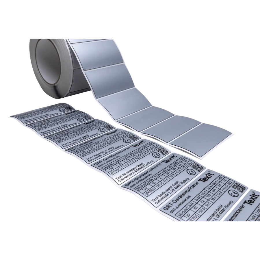 Kennzeichnungsschilder werden häufig als Typenschilder eingesetzt. Auf Typenschildern vermerkt der Hersteller bestimmte Daten und Informationen zu der Maschine/Anlage. Bei Texit finden Sie kostengünstige und robuste Typenschild Etiketten in unterschiedlichen Größen. Die Typenschild Etiketten sind selbstklebend und haften dauerhaft auf glatter Oberfläche (z.B. Metall und Lack). Sie sind von der Farbe her nicht von herkömmlichen Aluminium Typenschildern zu unterscheiden. Preislich sind sie jedoch deutlich günstiger und auch flexibler in der Anwendung. Diese Kennzeichnungsschilder lassen sich mit einem unserer Thermotransfer Drucksysteme flexibel bei Ihnen vor Ort nach Wunsch gestalten und bedrucken.